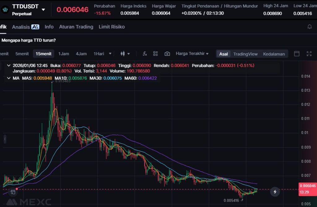 TTD melemah -18.78% ke harga $0.0058. Koreksi tajam ini menempatkan TTD sebagai salah satu losers utama hari ini, menandakan tekanan jual masih kuat pada sesi berjalan.