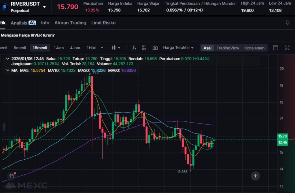 RIVER turun -12.99% dan diperdagangkan di $15.786. Meski penurunannya lebih rendah dibanding dua teratas losers, koreksi dua digit ini tetap menunjukkan tekanan jual yang cukup nyata.