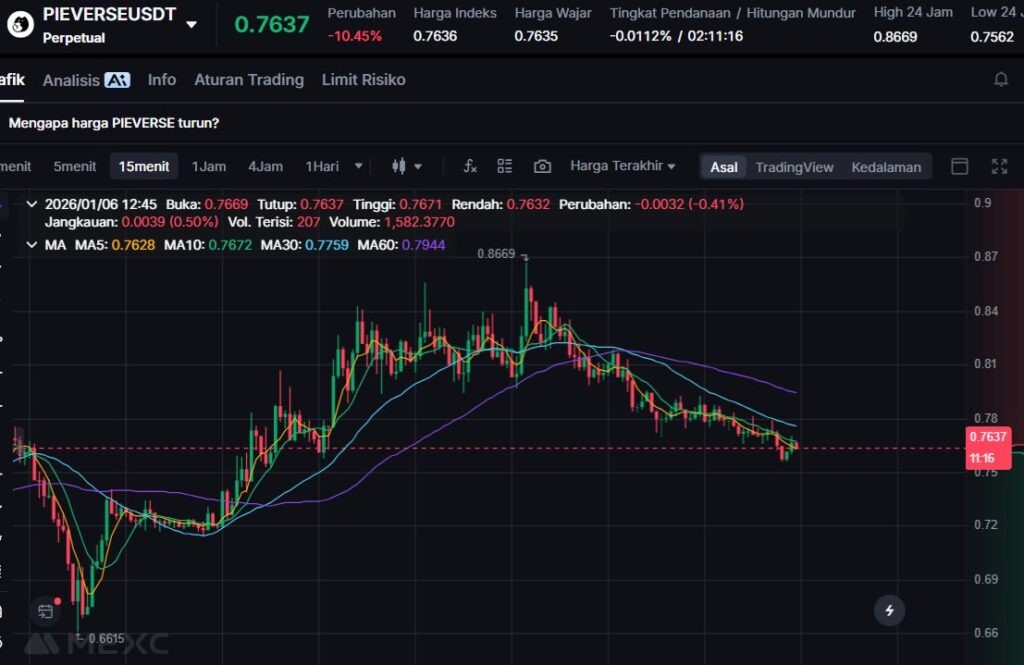 PIEVERSE turun -9.33% ke $0.7733. Koreksi single-digit besar seperti ini tetap signifikan untuk intraday, terutama saat market sedang dalam mode rotasi cepat.