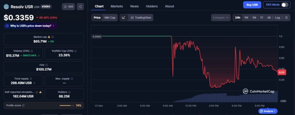 Stablecoin USR milik Resolv mengalami tekanan besar setelah kehilangan patokannya terhadap dolar AS dan sempat turun hingga sekitar US$0,14. Meski sempat rebound ke kisaran US$0,42, guncangan ini tetap memicu kekhawatiran di market karena depeg terjadi sangat dalam dan berlangsung cepat.