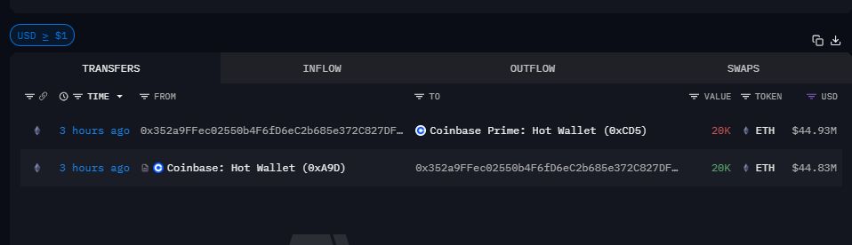 Sekitar tujuh menit setelah penarikan awal, wallet yang sama justru mengirim seluruh 20.000 ETH tersebut ke Coinbase Prime hot wallet. Saat transaksi kedua terjadi, nilai aset itu sudah naik menjadi sekitar US$44,93 juta, terutama karena harga ETH menguat di antara dua perpindahan tersebut.