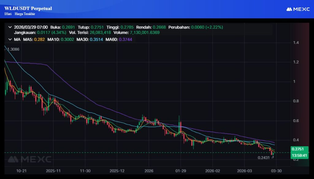 Di saat yang sama, WLD sempat menyentuh all-time low baru di kisaran US$0,2444. Level itu menandai pelemahan sekitar 97% dari puncaknya di area US$11,82 yang sempat dicapai pada Maret 2024.