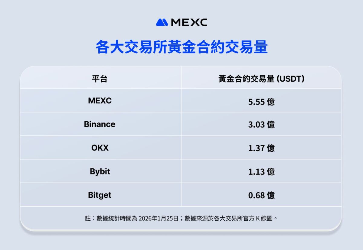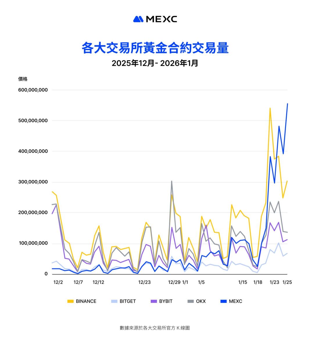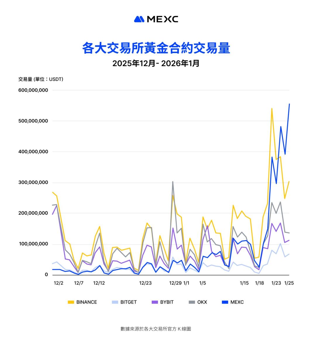隨著 1 月 18 日後金價連續突破歷史新高,MEXC 順勢開啟相關黃金合約限時零手續費活動。在行情與策略的雙重驅動下,交易量走出指數級行情。峰值出現於 1 月 25 日,單日成交額達 5.55 億美元,在主流平台中居於首位。