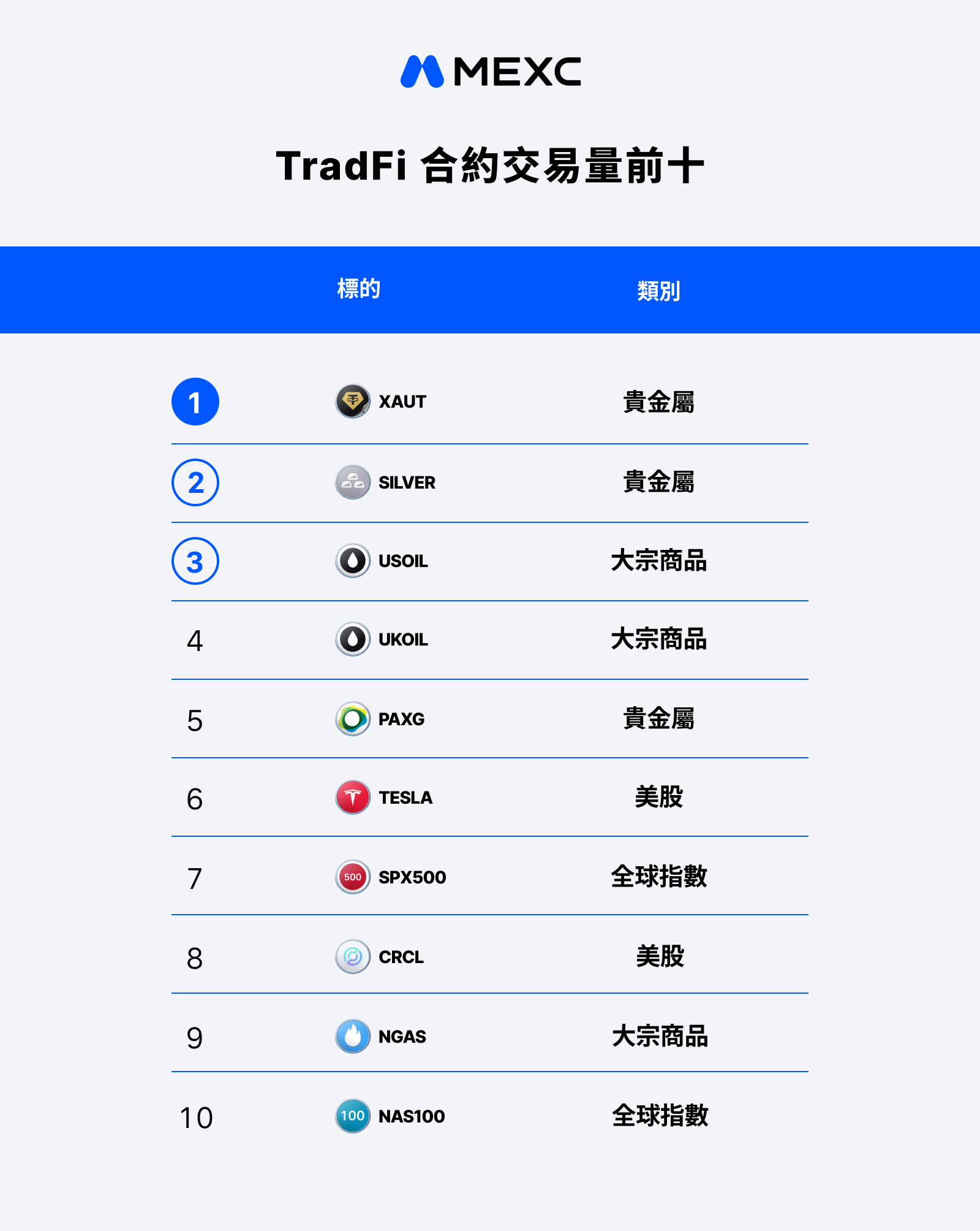 本月最高單日交易量出現在 3 月 3 日,當日伊朗封鎖霍爾木茲海峽,全球避險情緒驟然升溫,原油與貴金屬市場劇烈波動,MEXC 的 TradFi 合約成為用戶第一時間對沖與捕捉行情的工具。交易量前十標的中,貴金屬合約(XAUT、SILVER、PAXG)佔 3 席,大宗商品(USOIL、UKOIL、NGAS)佔 3 席,充分體現了本月宏觀不確定性下市場對貴金屬與大宗商品價格敞口的高度需求。此外,美股(TESLA、CRCL)與全球指數(SPX500、NAS100)也進入榜單,表現活躍。