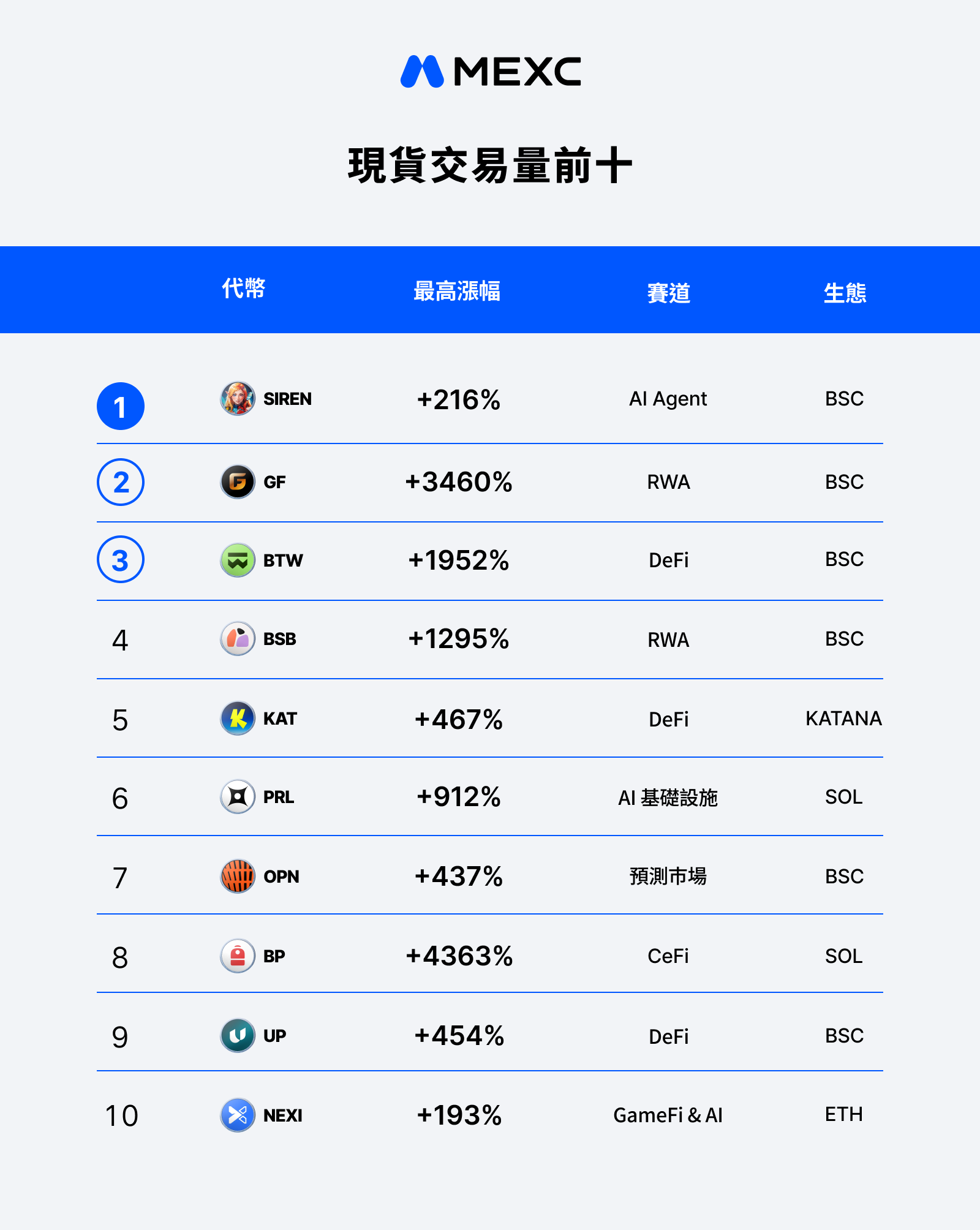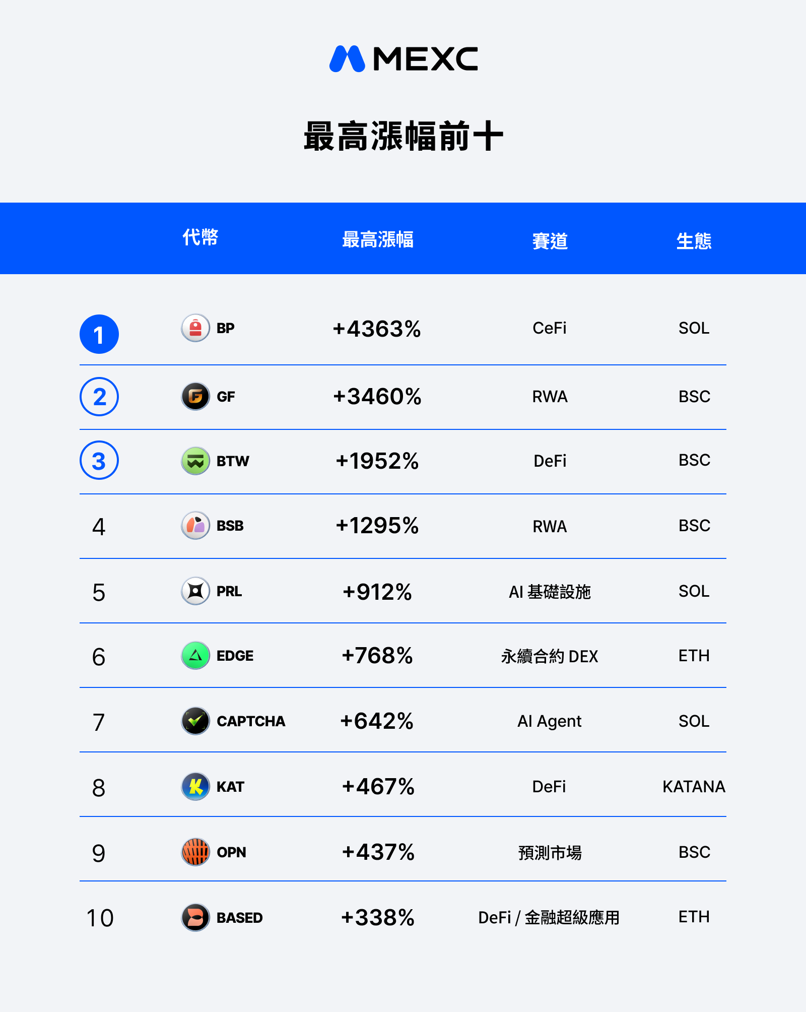 3 月最高漲幅 TOP10 平均漲幅達 1,463%。BP(+4,363%)居於榜首,反映市場對持牌 CeFi 交易所的重新定價。GF(+3,460%)與 BSB(+1,295%)受益於地緣政治不確定性下傳統資產上鏈的真實需求,監管明晰化進一步催化了資金向 RWA 賽道的集中配置。MEXC 憑藉快速上幣的優勢,讓用戶得以精準捕捉這波行情。