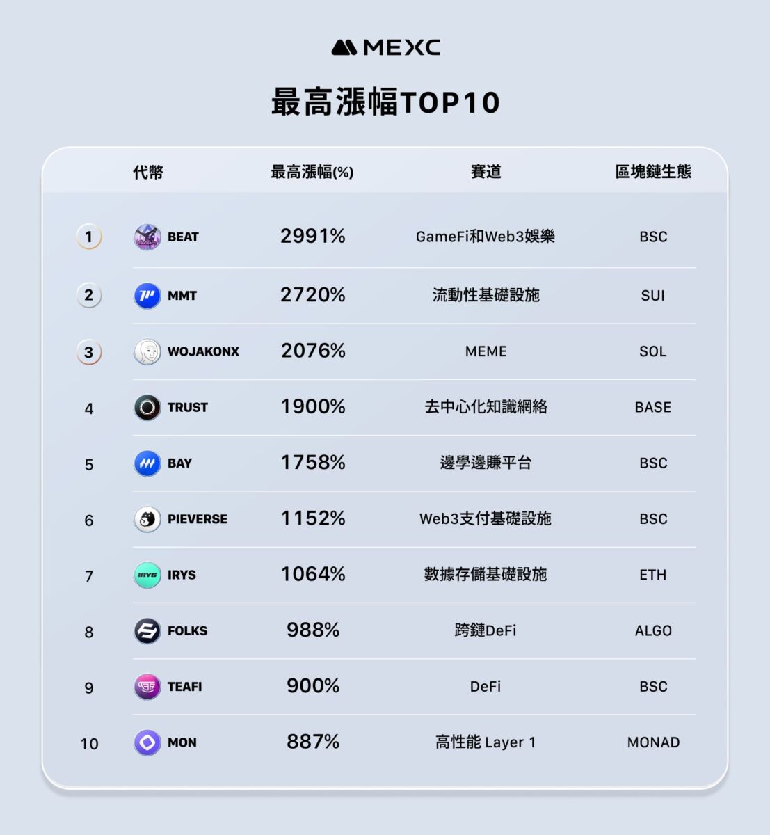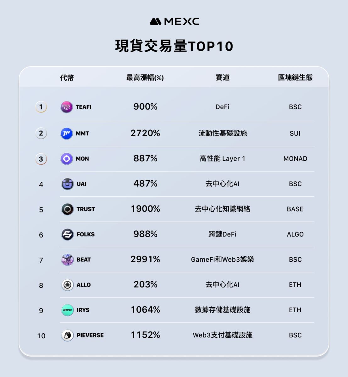 本月,新幣最高漲幅Top 10平均漲幅達1644%,最高漲幅達2991%(BEAT)。其中,8個幣種(BEAT、MMT、TRUST、PIEVERSE、IRYS、FOLKS、TEAFI、MON)同時入選現貨交易量Top 10,重合度高達80%,這是2025年迄今重合度最高的一個月,表明市場已從純情緒炒作轉向「真實交易深度 + 基本面支撐」的理性共識階段。